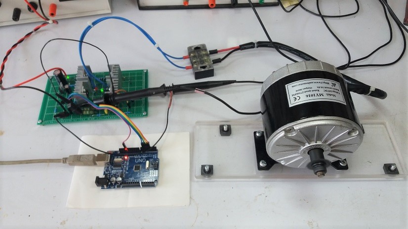 ในรูปที่ 9 และรูปที่ 10 แสดงผลการทดลองวัดสัญญาณที่เกิดขึ้นของสัญญาณพัลซ์วิดธ์มอดูเลตชั่นจากบอร์ด Arduino UNO และการปรับระดับสัญญาณเอาต์พุตพัลซ์วิดธ์มอดูเลตชั่นที่ขา 1 และขา 7 ไอซี IR2110/IR2113 เพื่อเป็นการตรวจสอบความถูกต้อง ซึ่งในการทดลองจะใช้ตัวต้านทานขนาด 30-100 โอห์มต่อระหว่างขา VS กับกราวด์ก่อน โดยผลที่ได้สามารถนำไปขับเพาเวอร์มอสเฟตหรือไอจีบีทีได้เป็นปกติ