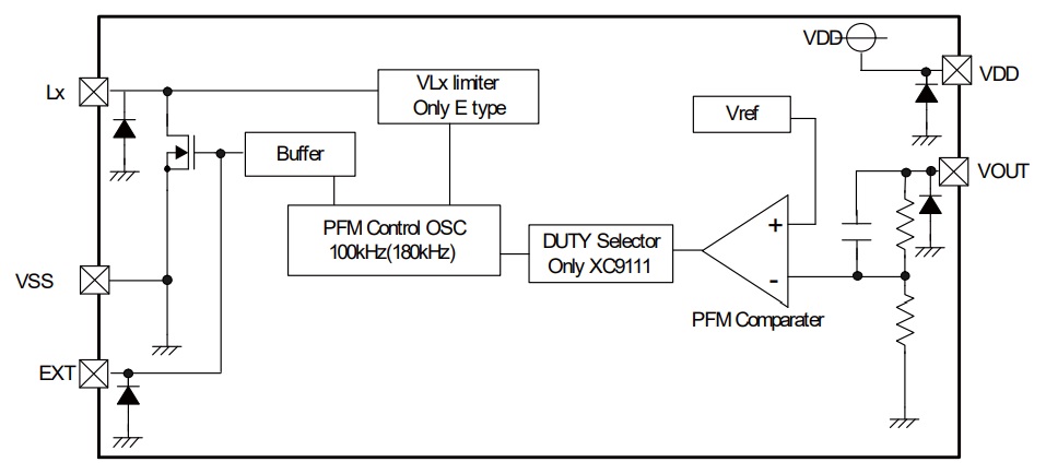ในรูปที่ 5 และรูปที่ 6 แสดงไอซีควบคุมแบบอะนาลอกที่ใช้วิธีการควบคุมแบบ PFM เบอร์ XC9110/XC9111 Series (PFM Controlled Step-Up DC/DC Converter) โดยในรูปที่ 5 แสดงบล๊อกไดอะแกรมโครงสร้างวงจรภายในตัวไอซีและรูปที่ 6 เป็นตัวอย่างการต่อใช้งานไอซี XC9111 ให้เป็นวงจร Step-Up DC/DC Converter [Datasheet for XC9110/XC9111 Series Ref.15]