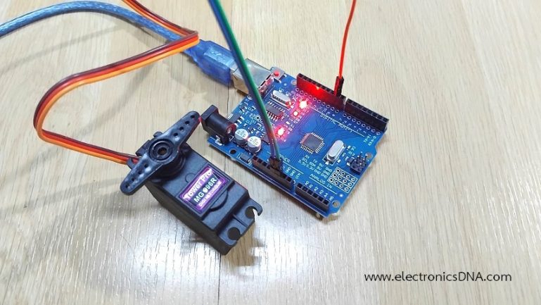 ในรูปที่ 1 แสดงการต่อวงจรสำหรับจำลองการทำงานด้วยโปรแกรม tinkercad.com โดยในรูปจะใช้ขา D9 ในการจ่ายสัญญาณพัลซ์วิดธ์มอดูเลตชั่น สำหรับควบคุมแตำแหน่งการเคลื่อนที่ของเซอร์โวมอเตอร์ จากนั้นจะใช้ออสซิลโลสโคปมาวัดสัญญาณที่ขา D9 เช่นกันเพื่อสังเกตความสัมพันธ์ระหว่างการเคลื่อนที่ของเซอร์โวมอเตอร์กับสัญญาณพัลซ์วิดธ์มอดูเลตชั่น