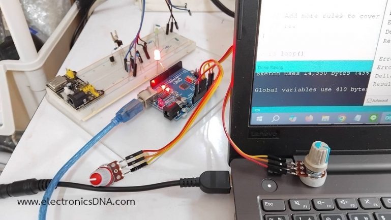 ในรูปที่ 1 และรูปที่ 2 แสดงลักษณะการต่ออุปกรณ์สำหรับทดลองและวงจรที่ใช้ในการทดลองการควบคุมแบบฟัซซี่ลอจิก โดยในการทดลองครั้งนี้จะใช้ตัวต้านทานปรับค่า (Variable Resistor : VR) เพื่อทดสอบการทำงานแทนค่าเซนเซอร์อุณหภูมิที่อ่านได้ในส่วนของอินพุตฟัซซี่ลอจิก ในส่วนเอาต์พุตจะส่งเป็นสัญญาณพัลซ์วิดธ์มอดูเลตชั่นที่ขา D9 และต่อแอลอีดีเพื่อสังเกตผลที่ได้จากการทำงาน